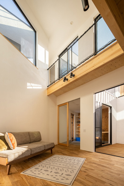 ソラマドの家。それは“空に向かって開いた大きな窓"がある、開放感いっぱいの暮らしの器。ウッドデッキの中庭やリビング上に設けられた吹き抜けは、多方面から家全体に光を届け、明るい空間を演出します。キッチンとダイニングテーブルが一体となった造作キッチン、上下で繋がる螺旋階段、あえて壁をつくらない事で自由に遊べるキッズスペース。間仕切りを少なくし、ひとつひとつの空間が繋がるように配置された室内は、家族のつながりも自然と増えます。また、屋上には陽当たりの良い広々としたルーフバルコニーを設置。開放的なプライベート空間として、家族の憩いの場となるでしょう。無垢材や漆喰など身体に良い素材を使用した柔らかい雰囲気と、子供たちが家の中でのびのびと遊べる空間づくりで、家族の笑顔が生まれるワクワクする家です。